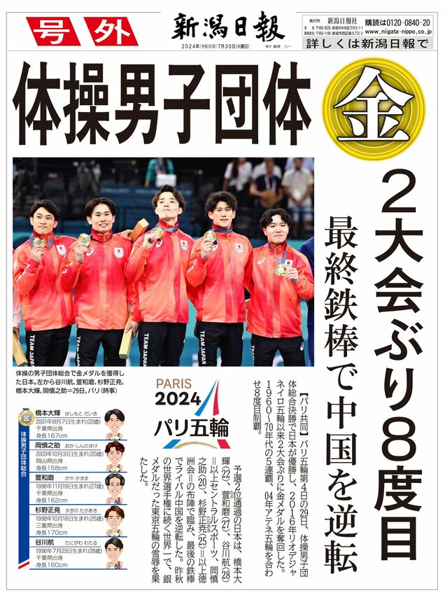 【号外】体操男子団体・日本2大会ぶり「金」 2024/7/30 6:50 (最終更新: 2024/7/30 8:25) PDFで号外を見る トップページで最新情報を見る 関連ニュース 【号外】米、イスラエル両軍がイラン攻撃 2/28 【号外】フィギュア女子で中井亜美(新潟市出身)が「銅」! 2/20 【号外】フィギュアペア・りくりゅう金メダル!日本勢初 2/17 【号外】スノボ男子HPで戸塚が金、山田が銅、平野(歩)は7位 2/14 【号外】スノーボード女子ビッグエアで村瀬心椛が「金」 2/10 【号外】スノーボード男子ビッグエアで木村葵来が金、木俣は銀 2/8 【号外】センバツ高校野球、帝京長岡と日本文理が出場決定! 1/30 【号外】衆院選、2月8日投開票 高市早苗首相が23日解散を表明 1/19 【号外】首相、衆院冒頭解散へ 1/13 【号外】柏崎刈羽原発再稼働「同意」、花角知事が赤沢経産相に伝達 2025/12/23 【号外】柏崎刈羽原発再稼働「容認」 新潟県議会、花角英世知事を信任 2025/12/22 【号外】新潟県知事が柏崎刈羽原発再稼働を容認 2025/11/21