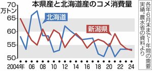 農林水産省が7月30日に発表した主食用米の「需要実績」(消費量)は、全国で前年比11万トン増の702万トン(速報値)となり、10年ぶりに増加した。農水省は、他の食品に比べた値頃感が背景にあるとみている。ただ新潟県産は不作の影響で消費量が減り、都道府県別で4年ぶりに2位に下がった。