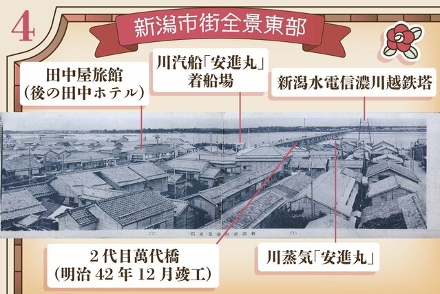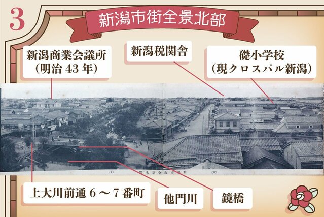 100年以上前に新潟市中心部を撮影したパノラマ絵はがきが見つかった。8枚続きで、右端の1枚目に写る萬代橋付近から左端の新潟県会議事堂(現県政記念館)付近までの市街地を見下ろすかたちで撮影。観光名所を入れながらぐるりとまちを見渡せる貴重な資料となっている。1908(明治41)年の新潟大火から間もないタイミングでもあり、復興した街並みが克明に写されている。