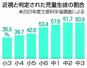 社会 小中学生の近視、学年上がるほど増加・文部科学省調査 パソコンなど電子機器の利用時間と関係も 2024/8/1 12:30 文部科学省は7月31日、小中学生を抽出して実施した近視の実態調査の結果を発表した。近視と判定された児童生徒は小学校中学年で4割程度だったのが、中学で6割程度となり、学年が上がるほど増える傾向が出た。... 残り624文字(全文:724文字) ここから先を読むには 続きを読む(会員登録する) 続きを読む(ログイン) 新潟日報朝刊を購読していますか? はい いいえ トップページで最新情報を見る 関連ニュース 上越市・元事業所の敷地で土壌から有害物質検出、健康被害確認されず 23:30 新発田市と糸魚川市でクマ「緊急銃猟」で駆除、県内3・4例目 ... 21:30 [新発田市女性殺害事件]最高裁が被告の上告棄却、再び無期確定... 21:15 キャバクラ店で従業員に客を接待させ無許可で風俗営業したなどの... 21:10 消火栓のふたや電線など約24万円相当の金属盗んだ疑い 新潟北... 20:40 東京→越後湯沢の上越新幹線最終列車、10~20分繰り上げへ…... 20:10 [2026年度私立高校入試・新潟]募集定員・日程まとめ(一覧... 19:30 長岡市の県道を歩いていた70代男性が軽貨物車にはねられ重体、... 19:10 18歳未満と知りながら…女子高校生とみだらな行為の疑い、新潟... 18:35 融雪のための高所作業で宙づり状態に…49歳男性が低体温症で死... 18:05 認知症治療薬の研究に心血注ぎ…ノーベル賞の“登竜門”受賞、長... 17:00 スキーリフト、乗り方学んで安全に!長岡市の四郎丸小・神田小で... 16:45