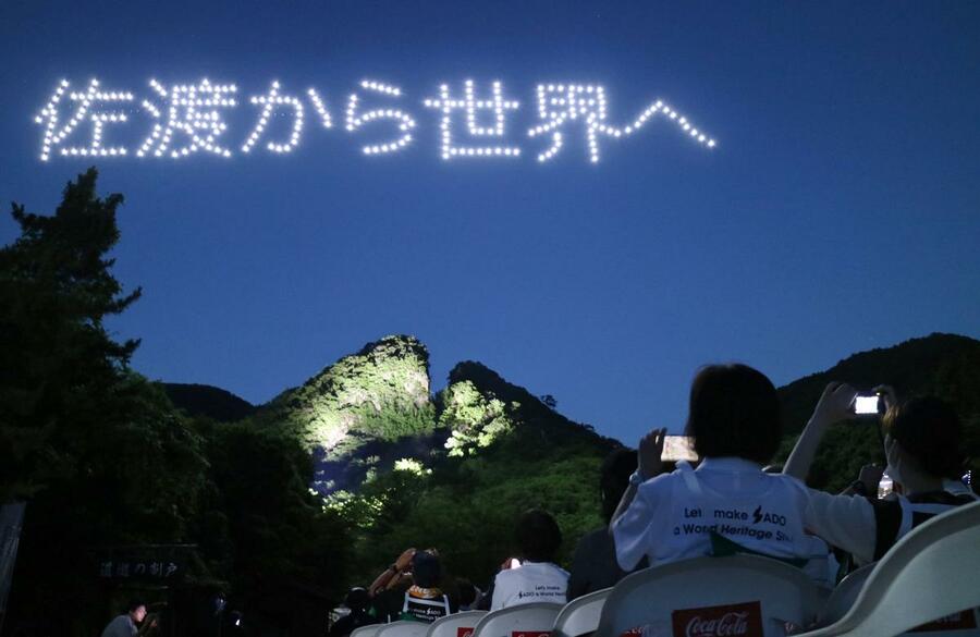 新潟県の「佐渡島(さど)の金山」の世界文化遺産登録を祝う記念セレモニーが8月1日、佐渡市相川地区で開かれた。ドローンショーやちょうちん行列が行われ、長年の悲願達成を祝福する光が、喜びに沸く金山の地元を優しく照らした。