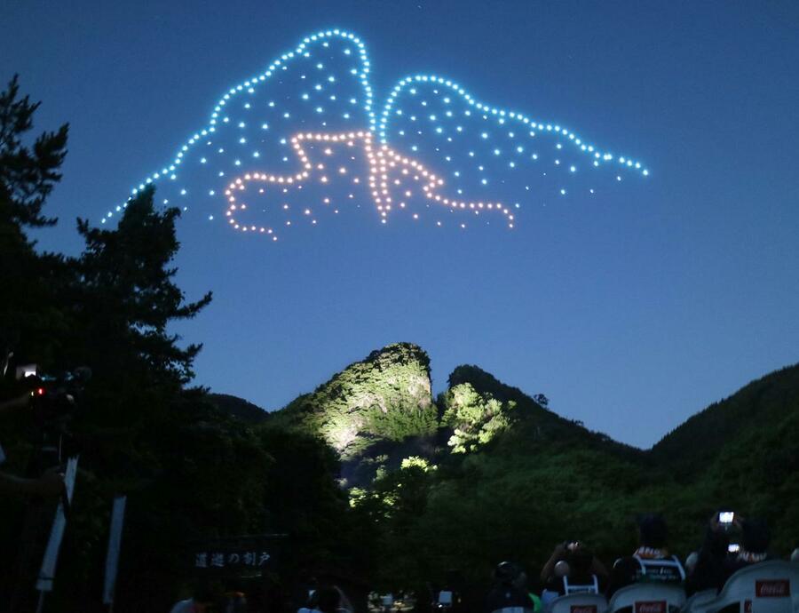 金山のシンボル「道遊の割戸」上空で行われたドローンショーでは、約300機が「佐渡から世界へ」などの文字のほか、小判や採掘の様子を表した絵柄を夜空に描いた。