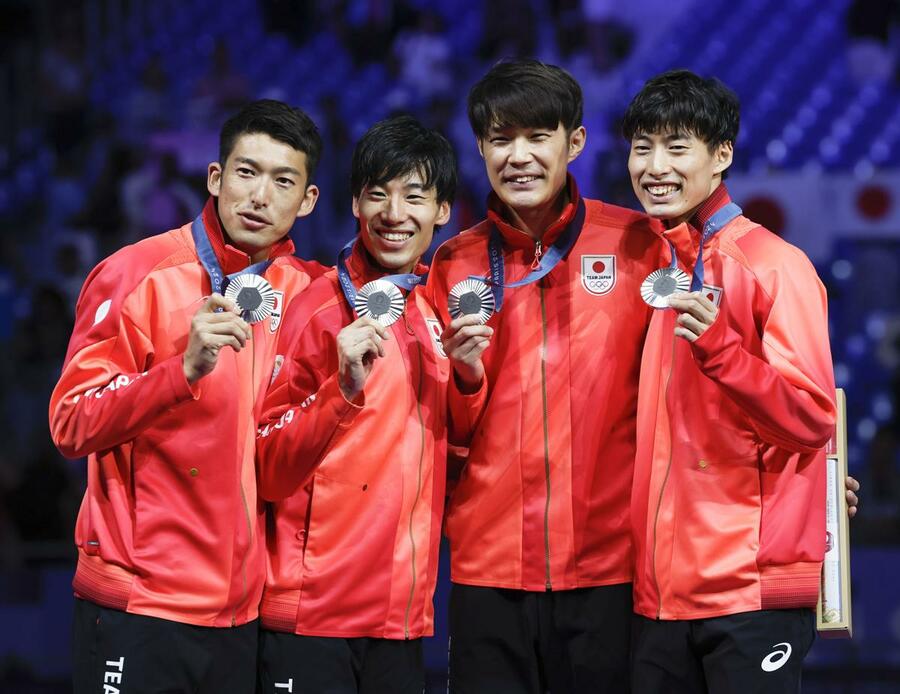 フェンシング男子エペ団体で銀メダルを獲得した日本。左から見延和靖、加納虹輝、山田優、古俣聖=パリ(共同)