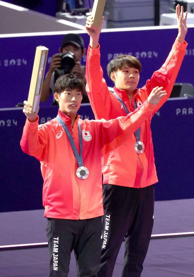 フェンシング 男子エペ団体銀メダルを獲得し、メダルセレモニーの後、スタンドに手を振る古俣聖(左)=8月2日、パリ(新潟日報社写真映像部・新井田悠)