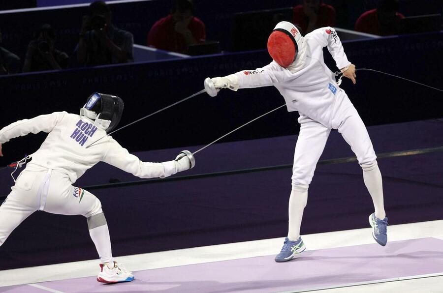 男子エペ団体決勝 日本-ハンガリー 古俣聖(右)がポイントを奪い15-15の同点に追いつく=パリ(新潟日報社写真映像部・新井田悠)