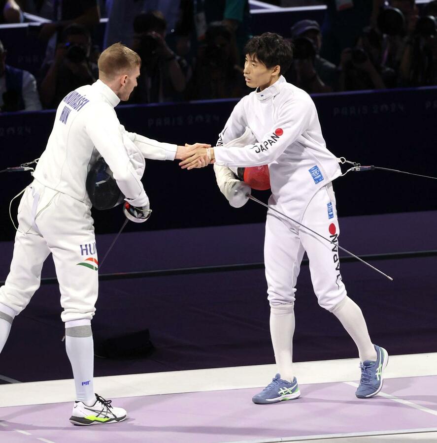 男子エペ団体決勝 日本-ハンガリー 第3試合を終え、相手選手と握手する古俣聖(右)=パリ(新潟日報社写真映像部・新井田悠)