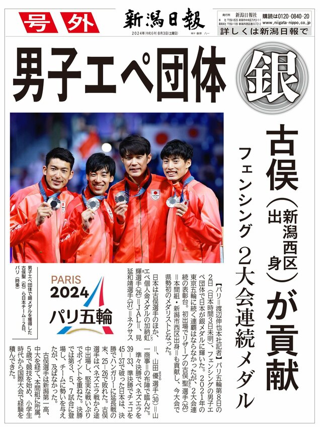 【号外】パリ五輪・フェンシング男子エペ団体「銀」 2024/8/3 7:05 (最終更新: 2024/8/4 14:02) PDFで号外を見る トップページで最新情報を見る 関連ニュース 【号外】首相、衆院冒頭解散へ 1/13 【号外】柏崎刈羽原発再稼働「同意」、花角知事が赤沢経産相に伝達 2025/12/23 【号外】柏崎刈羽原発再稼働「容認」 新潟県議会、花角英世知事を信任 2025/12/22 【号外】新潟県知事が柏崎刈羽原発再稼働を容認 2025/11/21 【号外】日経平均初の5万円台 2025/10/27 【号外】新首相に高市早苗氏、女性で初めて選出 2025/10/21 【号外】燕市の新市長に前市議の佐野大輔氏 2025/10/20 【号外】北信越高校野球・帝京長岡が優勝 2025/10/19 【号外】公明党が連立政権離脱へ 2025/10/10 【号外】ガザ全人質解放へ 2025/10/9 【号外】ノーベル化学賞に北川進京都大特別教授 2025/10/8 ノーベル化学賞に京都大特別教授の北川進氏ら 2025/10/8