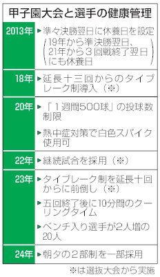 スポーツ 高校野球 球児たちの“熱き夏”どう守る?酷暑対策進む甲子園大会 「朝夕2部制」導入も、1日4試合での実施は終了時間に懸念…“夢の舞台”維持へ大胆な改革必要 2024/8/11 11:00 高校野球の甲子園大会で選手の健康を守る取り組みが加速している。2013年に設定された大会中の休養日が3日に増え、18年に始まった延長十三回からのタイブレーク制は2023年、延長十回からに前倒しされた。 熱中症... 残り604文字(全文:709文字) ここから先を読むには 続きを読む(会員登録する) 続きを読む(ログイン) 新潟日報朝刊を購読していますか? はい いいえ トップページで最新情報を見る 関連ニュース [高校野球・夏の甲子園2024]新潟産大付、初戦は2017年... 2024/8/4 [インタビュー・高校野球 夏の甲子園大会]「朝夕2部制」なぜ... 2024/8/1 [高校野球・夏の甲子園大会2024]出場49校が決定!健大高... 2024/7/31 2024年夏の甲子園に先駆け…「朝・夕2部制」導入の少年野球... 2024/5/12 猛暑から球児守れ!2024年夏の甲子園で「朝・夕2部制」試験... 2024/4/20 センバツ21世紀枠候補校の六日町高校(南魚沼市)、県高野連が... 12/5 【明治神宮野球大会高校の部】帝京長岡の工藤壱朗「まだ力不足」... 11/14 【明治神宮野球大会高校の部】帝京長岡“初の全国”は惜しくも初... 11/14 [明治神宮野球大会高校の部]14日の開幕戦に登場の帝京長岡、... 11/12 来春のセンバツ21世紀枠、新潟県推薦校に六日町高校 11/12 [明治神宮野球大会高校の部]新潟県勢全戦績まとめ 県勢が持つ... 11/12 イチローさん“思い出”の悠久山で柵越え!中越高球児らにイチ流... 11/9
