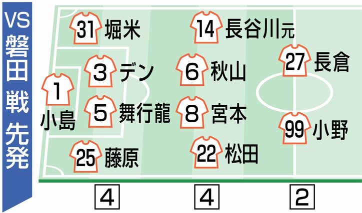 序盤から攻撃のリズムがよく、前半14分、MF宮本英治がJ1初ゴールとなるボレーシュートで先制点を奪った。27分にはMF秋山裕紀のミドルシュートで追加点を奪った。