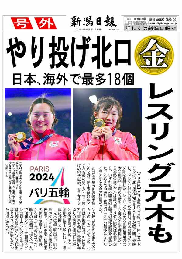 【号外】パリ五輪・海外開催オリンピックでの金メダル数「18」過去最多!陸上女子やり投げ北口、レスリング女子62キロ級元木 2024/8/11 7:35 (最終更新: 2024/8/11 7:38) PDFで号外を見る トップページで最新情報を見る 関連ニュース 【号外】首相、衆院冒頭解散へ 1/13 【号外】柏崎刈羽原発再稼働「同意」、花角知事が赤沢経産相に伝達 2025/12/23 【号外】柏崎刈羽原発再稼働「容認」 新潟県議会、花角英世知事を信任 2025/12/22 【号外】新潟県知事が柏崎刈羽原発再稼働を容認 2025/11/21 【号外】日経平均初の5万円台 2025/10/27 【号外】新首相に高市早苗氏、女性で初めて選出 2025/10/21 【号外】燕市の新市長に前市議の佐野大輔氏 2025/10/20 【号外】北信越高校野球・帝京長岡が優勝 2025/10/19 【号外】公明党が連立政権離脱へ 2025/10/10 【号外】ガザ全人質解放へ 2025/10/9 【号外】ノーベル化学賞に北川進京都大特別教授 2025/10/8 ノーベル化学賞に京都大特別教授の北川進氏ら 2025/10/8