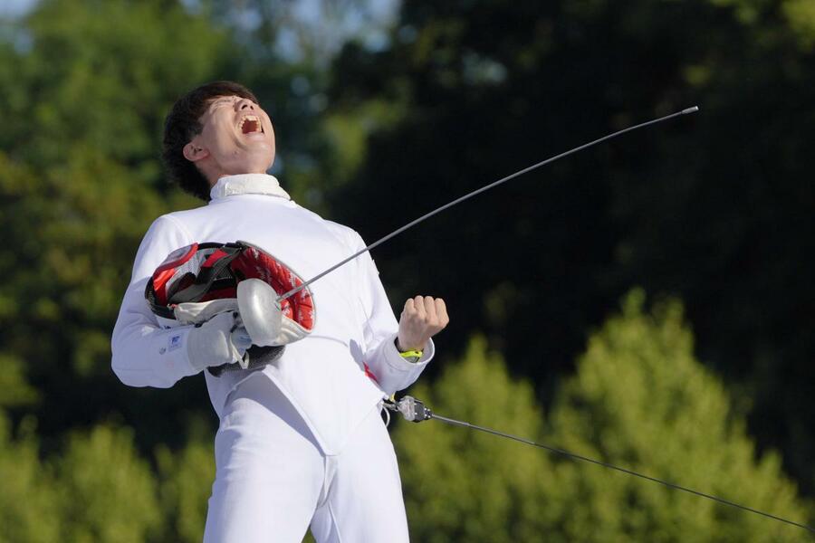 男子決勝 フェンシングで韓国選手に勝利し、喜ぶ佐藤大宗=パリ郊外(共同)