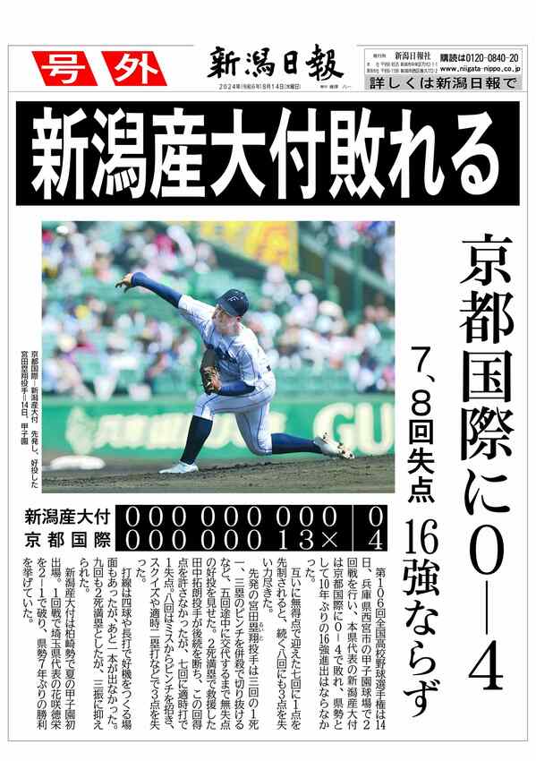 【号外】夏の甲子園、新潟産大付が2回戦敗退 2024/8/14 15:55 (最終更新: 2024/8/14 15:58) PDFで号外を見る トップページで最新情報を見る 関連ニュース 【号外】首相、衆院冒頭解散へ 1/13 【号外】柏崎刈羽原発再稼働「同意」、花角知事が赤沢経産相に伝達 2025/12/23 【号外】柏崎刈羽原発再稼働「容認」 新潟県議会、花角英世知事を信任 2025/12/22 【号外】新潟県知事が柏崎刈羽原発再稼働を容認 2025/11/21 【号外】日経平均初の5万円台 2025/10/27 【号外】新首相に高市早苗氏、女性で初めて選出 2025/10/21 【号外】燕市の新市長に前市議の佐野大輔氏 2025/10/20 【号外】北信越高校野球・帝京長岡が優勝 2025/10/19 【号外】公明党が連立政権離脱へ 2025/10/10 【号外】ガザ全人質解放へ 2025/10/9 【号外】ノーベル化学賞に北川進京都大特別教授 2025/10/8 ノーベル化学賞に京都大特別教授の北川進氏ら 2025/10/8