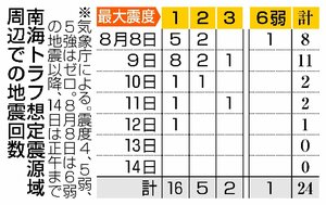 社会 地震・災害 南海トラフ地震の臨時情報に伴う政府の注意呼びかけ、8月15日午後5時に終わる見通し 2024/8/14 19:30 (最終更新: 2024/8/15 0:16) 南海トラフ地震の臨時情報(巨大地震注意)に伴い、政府が防災対応の再確認を求めた注意の呼びかけは、大きな変化がなければ発表から1週間の8月15日午後5時に終わる見通しだ。臨時情報の発表から、改めて各地で... 残り1063文字(全文:1164文字) ここから先を読むには 続きを読む(会員登録する) 続きを読む(ログイン) 新潟日報朝刊を購読していますか? はい いいえ トップページで最新情報を見る 関連ニュース 初の南海トラフ巨大地震「臨時情報」、自治体や住民の対応状況を... 2024/8/12 [地震情報]宮崎県南部で震度6弱、気象庁が南海トラフ巨大地震... 2024/8/8 [ニュースQ&A]「南海トラフ地震臨時情報」とは?宮崎県で震... 2024/8/8 夏休み中のわが子、災害から守るには?南海トラフ巨大地震「臨時... 2024/8/10 [地震情報]関東地方で震度4、新潟県内は南魚沼市で震度1(1... 19:14 [地震情報]青森県などで震度4 新潟県内は村上市で震度2、新... 12:05 【青森県震度6強】新潟県内企業は大きな被害なし、後発地震に備... 12/9 【青森県震度6強】青森、岩手、北海道で51人がけが 「後発地... 12/9 [能登半島地震]被災住宅の公費解体、事業完了を新潟市長に報告... 12/9 【青森県で震度6強】負傷者は34人に、7道県に初の「後発地震... 12/9 [地震情報・新潟]村上市で震度2(12月9日) 12/9 【青森県震度6強】被災地で断水や通行止め…新潟県は新発田市と... 12/8