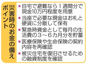 南海トラフ巨大地震駿河湾から日向灘沖の海底に延びる溝状の地形(トラフ)に沿って発生する地震。おおむね100〜150年間隔で発生しているとされる。政府の地震調査委員会はマグニチュード(M)8〜9級の地震が30年以内に起きる確率を70〜80%と算出。国は死者を最大32万3千人と推計している。への注意を促す臨時情報が8月8日から15日にかけて発表された。いざという時に困らないよう、家庭ではどのようなお金の備えをするべきか。ファイナンシャルプランナー(FP)の大川幸子さん(76)に話を聞いた。