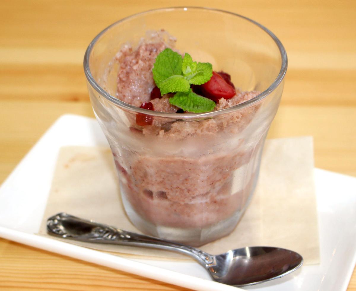 魚沼市守門地域の住民グループが運営する直売所「元気すもん」(須原)で、2024年春からの新メニューとして「かわいいあまざけフローズン」を提供している。赤米とコシヒカリの米麹(こうじ)だけで作った甘酒を冷凍した一品だ。