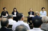 4候補による意見発表会の終了後、報道陣の取材に応じる(右から)中村真衣、佐藤信秋、安田佳世、市川恭嗣の各氏=8月10日、新潟市中央区の自民党県連会館