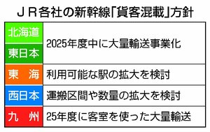 経済 鉄道・バス・乗り物 JR各社が新幹線の「貨客混載」拡大へ!荷物を高速&大量輸送、生鮮品や精密機器まで…収益源の開拓に注力 2024/8/25 6:00 JR各社が、乗客を乗せた新幹線で荷物も運ぶ「貨客混載」サービスを拡大させることが分かった。2024年4月にJR東海が参入して北海道から九州までつながったことを追い風に、鮮度が高い特産品や精密機器を迅速に定時で... 残り1669文字(全文:1774文字) ここから先を読むには 続きを読む(会員登録する) 続きを読む(ログイン) 新潟日報朝刊を購読していますか? はい いいえ トップページで最新情報を見る 関連ニュース JR四国が運転士不足で減便…給与低く激務、若手の離職止まらず... 2024/8/18 さらばフリーゲージトレイン…新幹線と在来線の両方に対応「FG... 2024/8/12 JR西日本の「存廃協議」目安、大糸線(新潟-長野)など15路... 2024/8/5 さらば“ロングノーズ”…山陽新幹線「500系」、2027年内... 2024/8/3 JR東日本の1日平均乗客数、全区間の26%が1000人未満・... 2024/7/28 トキエア“試練”の冬 「二の舞繰り返さない」運航の安定性向上... 2025/12/28 運休から3年余、JR米坂線「不通区間」はいま… 坂町から今泉... 2025/12/27 粟島汽船、6月にフェリータラップ外さず損傷事故 北陸信越運輸... 2025/12/26 ガラガラガーン!大量の鉄塊をコンテナからダンプ車に…駅に響く... 2025/12/24 30年ぶり佐渡汽船運賃改定の影響は…世界遺産効果で観光客は増... 2025/12/24 高速バス4路線で値上げ、2026年4月から平均1割増 上越線... 2025/12/23 大糸線の絶景をカレンダーで紹介 糸魚川市観光協会などで販売、... 2025/12/23