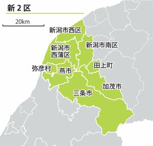 県央地域と新潟市西部からなる衆院新・新潟2区新潟市西区、新潟市西蒲区、新潟市南区、三条市、燕市、加茂市、田上町、弥彦村は、自民党の細田健一氏(60)=旧2区=と立憲民主党の菊田真紀子氏(54)=旧4区=による現職同士の戦いに、日本維新の会の新人井上基之氏(44)が割って入る構図が予想される。菊田、井上両氏は自民派閥の裏金事件を追及。安倍派に所属し、裏金づくりに関与した細田氏が守勢に立たされている。...