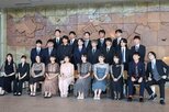 新井中の後輩らと記念撮影する小海遥選手(左から3人目)=8月26日、妙高市役所