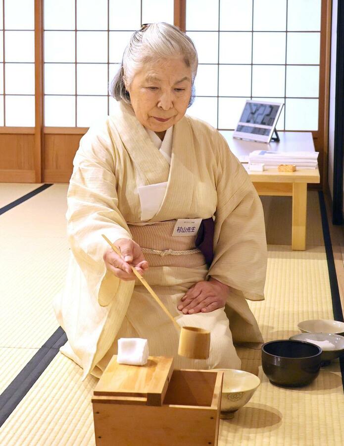 8月上旬、村山さんの初めての茶道教室が、十日町市の市民交流センター「分じろう」の和室で開かれた。茶道宗徧(そうへん)流教授の免状を持つ村山さん。茶道初心者の生徒6人にお手前を披露した。