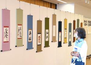 36回目の今年は、133点を展示する。「ありがとう」「愛」などの言葉をしたためた半紙を、色とりどりの掛け軸に貼っており、十人十色の個性がうかがえる。
