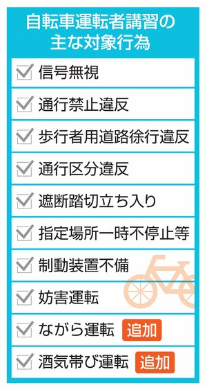 社会 自転車運転時の携帯電話使用や酒気帯びに罰則、11月1日に改正道交法施行 違反繰り返しで講習も 2024/9/7 15:20 政府は、自転車走行中の携帯電話使用(ながら運転)や酒気帯び運転に罰則を新設した改正道交法を11月1日に施行すると決めた。これらの違反を繰り返した人に、自転車運転者講習の受講を命令できるようにする道交法... 残り307文字(全文:408文字) この記事を読むには 会員登録が必要です 無料で会員登録して続きを読む 会員の方はこちら(ログイン) 会員のご案内 レギュラープラン【おすすめ】 すべての記事と紙面ビューアー(電子版)を無制限にお読みいただけます。 月額3,300円(税込み)。 新聞を購読されている方は無料です。 ライトプラン 無料記事と有料記事(レギュラープラン限定記事を除く)を月50本までお読みいただけます。 月額1,650円(税込み)。 無料会員 無料記事と有料記事を月2本までお読みいただけます。 無料で会員登録して続きを読む トップページで最新情報を見る 関連ニュース 全国の交通事故死者2年連続増、高齢者の運転ミス多く・2024... 2024/8/4 会社員や公務員らの従来型保険証、有効期限が迫る…12月2日以... 10:00 [クマ目撃情報]村上市北田中の住宅付近で1頭徘徊と通報(11... 9:13 昭和期の曲で入院患者に笑顔と元気を♡県立加茂病院で歌謡ショー... 9:00 ボタン電池?体温計?…「佐渡クリーンセンター」で3回にわたり... 9:00 夜間中学の役割を知ろう!新発田市で11月15日にセミナー、映... 8:00 楽しんで障害福祉を知ってほしい☆車椅子に乗ったり、手袋で折り... 7:00 三条市で11月9日に八十里越フォーラム、今回は「出発の地・吉... 6:00 「外国人が住民の1割超」全国13都道府県に27市区町村、新潟... 5:00 つながる力が地域を変える!地域福祉推進へ三条市でフォーラム ... 11/2 [新潟県の天気・気象情報]11月3日夜遅くにかけて大雨、突風... 11/2 [クマ・イノシシ目撃情報]加茂市、村上市、五泉市、阿賀野市、... 11/2 特集・連載 県内でインフルエンザが流行期入り、昨年より約3週間早い 魚沼... 10/30 【高校入試・新潟】最新情報&お役立ち情報まとめ 倍率・過去問も 7/28 漫画で知る「うつ病」とは? 若手社員が休職→通院→復職するま... 6/13 [紅葉スポット×花スポット]新潟県内の紅葉や花畑、映える名所... 5/29 【猫動画・新作あり】新潟県内「猫のいる店」♡モフモフに触れる... 10/29 [WEリーグ]今からでも間に合う!アルビレックス新潟レディー... 8/14 【機動戦士ガンダムジークアクス】鶴巻和哉監督(五泉市出身)が... 8/4 [プロ野球ドラフト会議]プロ志望届、新潟県関係は7人が提出!... 10/9 Otona+ 今や「1兆円市場」冷凍食品はなぜ愛されるのか?県民に人気の商... 10/28 【動画あり】新潟の夜空染めたオーロラ、実は江戸時代にも目撃さ... 10/21 卵子提供で2児出産、自助グループ立ち上げ当事者に寄り添い…芸... 10/14 山頂に神社、小学校の屋上…各地に点在する「三角点」って?形は... 9/30 「アクシアル」「コメリ」などプライベートブランド開発の裏側お... 9/23