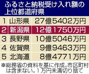 2023年度の新潟県のふるさと納税生まれ故郷など地方を活性化するため2008年度に始まった。自己負担分の2千円を除いた額が住民税、所得税から差し引かれる。控除額には上限があり、所得や世帯構成などに応じて変わる。豪華な返礼品を呼び水とした自治体の寄付獲得競争が過熱。19年6月からは返礼品は「寄付額の30%以下の地場産品」とし、ルールを守る自治体だけが参加できる制度に移行した。返礼品を含む経費は寄付額の50%以下に抑える必要がある。の寄付受け入れ額が過去最高の12億1750万円となり、都道府県として全国2位となったことが9月3日、新潟日報社のまとめで分かった。22年度は山形県、長野県に次いで3位だったが、長野を抜いた。22年度比3億8594万円の増加。新潟県外への寄付による県民税の減収(流出)や返礼品の経費を除いた実質的な収支も伸び、過去最高の2億4502万円の「黒字」で前年度から倍増した。