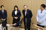 選挙対策委員会の終了後、報道陣の取材に応じる自民党県連の岩村良一幹事長(左)と中村康司総務会長=9月6日、新潟市中央区