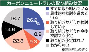 第四北越リサーチ&コンサルティング(新潟市中央区)は、温室効果ガス排出量について実質ゼロを目指すカーボンニュートラルに関する新潟県内企業の調査結果をまとめた。「すでに取り組んでいる」が26・2%と、前回の23年上期調査に比べ3・2ポイント増加した。「具体的な検討を進めている」(8・9%)を含め、取り組みに前向きな企業は前回調査比6・2ポイント増の35・1%となり、関心の高まりが見られた。