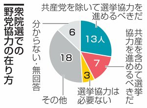 9月23日投開票の立憲民主党代表選に向け、共同通信が9月15日までに全都道府県連幹部計47人を対象に実施したアンケートで、次期衆院選を見据えた野党協力に関し、神奈川や静岡、佐賀など13人が「共産党を除いて選挙協力を進めるべきだ」と...