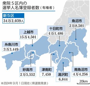 自民党総裁選が熱を帯びる中、衆院早期解散論が広がっている。衆院新・新潟5区上越市、糸魚川市、妙高市、南魚沼市、魚沼市、十日町市、津南町、湯沢町は、新潟県上越市を中心とする旧6区に南魚沼、魚沼、湯沢の3市町を加えた計8市町からなる。ここを舞台に、2021年の前回衆院選で初当選した立憲民主党の現職梅谷守氏(50)=旧6区=と、130票差で敗れて比例復活した自民党の現職高鳥修一氏(63)=比例北陸信越=が4度目の対決をする見通しだ。焦点の一つが魚沼地域3市町での得票。過去の選挙結果から戦いを展望し、新たに加わった選挙区での両氏の動向を探った。
