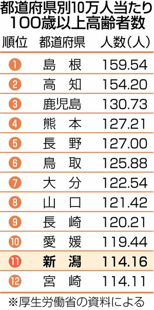新潟県の100歳以上の高齢者は2427人で、女性2164人、男性263人。