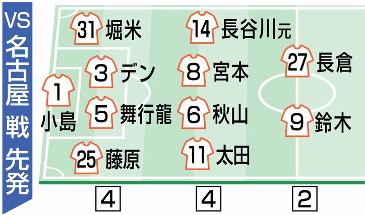 序盤は名古屋にボールを持たれる時間が続いた。前半15分、左クロスから頭で合わされ、先制された。その後も相手ペースが続いた。GK小島亨介の好守でピンチをしのいだが、44分にカウンターから2点目を奪われた。