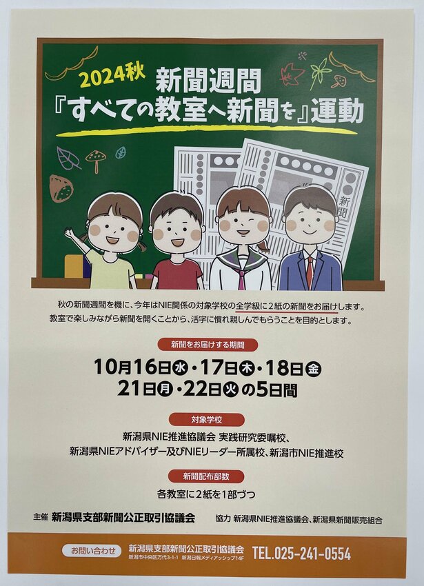 日頃より本県NIE推進に際し、ご理解とご協力を賜り、感謝申し上げます。 昨年に引き続き、新潟県支部新聞公正取引協議会より、「新聞に慣れ親しみ、活字を読む機会を増やす」ためとして、NIE関係校の全学級に、新聞2紙を無償提供させていただく運びとなりました。