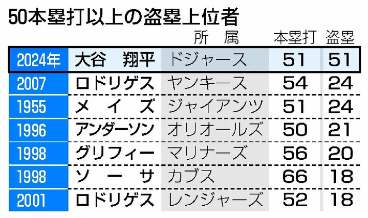 50本塁打はアジア選手初で、2001年にショーン・グリーンがマークした49本塁打の球団記録を抜いた。日本選手のシーズン50盗塁は、01年に56個で盗塁王を獲得したマリナーズのイチロー以来、2人目。