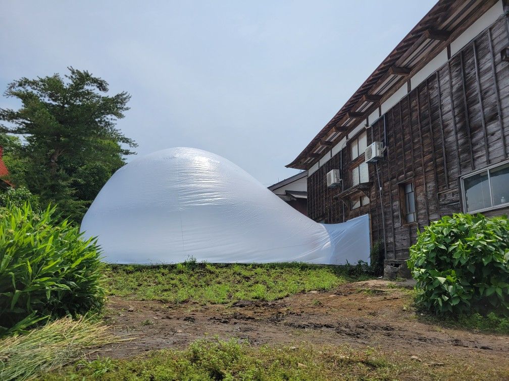 隣接する民家は、玄関から巨大な白い泡?フォトスポットとして大人気となっている清津峡渓谷トンネルの作品(2018年)を手がけたマ・ヤンソンの新作です。ガイド本を読むと「泡」なのだそうですが、漫画の吹き出しのようにも見えて、家が「寄ってけてー」と言ってるみたいで愉快でした。