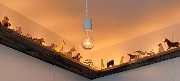 カバコフの新作もあります。「―天井に天国を―」と題した空間アートは、寝室らしき部屋の天井近くに、壁に沿って棚が巡らされています。その棚の上は、さまざまな動物が暮らすユートピア! はしごがかけられ、部屋の主も好きなときに〝訪問〟することができます。
