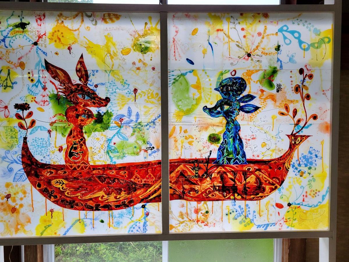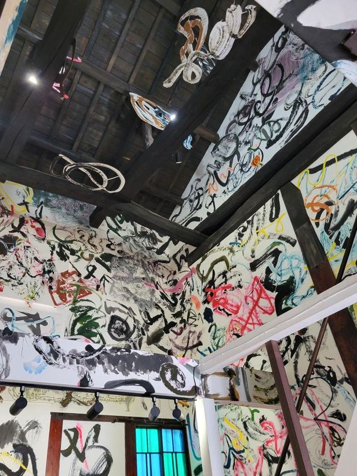 中国作家の展示、制作拠点となっている十日町市室野の中国ハウスを訪ねました。空き家を改装した室内は、天井や壁すべてがキャンバス。自由に走らせた筆跡や色彩が踊り、弾んだ気分になります。