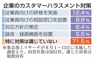 社会 カスハラ未対策の企業7割超、被害を受けた企業は2割 安心して働ける職場整備ほど遠く 東京商工リサーチ調査 2024/9/23 8:00 東京商工リサーチが実施したカスタマーハラスメント(カスハラ)に関する調査で、回答した約5千社のうち「特に対策は講じていない」企業が71・5%に上ることが分かった。... 残り462文字(全文:544文字) ここから先を読むには 続きを読む(会員登録する) 続きを読む(ログイン) 新潟日報朝刊を購読していますか? はい いいえ トップページで最新情報を見る 関連ニュース 【速報】新潟市中央区「サテライト新潟」1月18日営業終了、競... 19:00 長岡市で民家近くの柿の木に熊、市内初の緊急銃猟で駆除 県内12例目 18:35 村上市の証明書コンビニ交付で障害、576件交付できず 復旧に... 17:30 深刻化する格差社会、新たな下層階級「アンダークラス」とは…早... 17:00 横断歩道で一時停止しっかりと!あいおいニッセイが新潟デザイン... 16:45 長岡市中心部のビル改修に楽しいアイデア満載…新潟大学付属長岡... 16:15 長岡市の中学校・休日部活動「地域移行」3カ月、生徒・指導者数... 16:00 アルビ退団の堀米悠斗選手、モチベーションを上げる秘けつは…南... 15:30 [熊・イノシシ目撃情報]村上市、長岡市、上越市(12月16日) 14:15 人気おにぎり店「ぼんご」の右近由美子さんら4人受賞!新潟女性... 14:15 県立高校再編の遅れが起こした“逆転現象”…3学級以下の小規模... 13:00 三条市産のナシが宇宙ステーションへ!県産の生鮮食品搭載は初「... 12:00