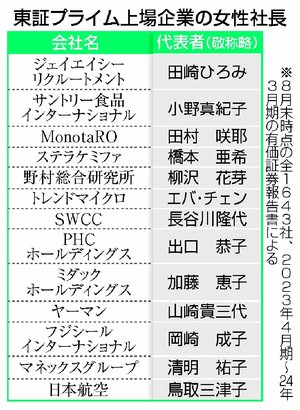 東京証券取引所の最上位プライム市場に上場する企業1643社のうち女性社長は13人、全体の0・8%にとどまることが9月16日分かった。全対象企業の2023年度有価証券報告書を24年8月末時点で共同通信社が分析した。女性役員は3千人を超え19年度から倍増したが、社長のジェンダー格差は依然大きく、多様な視点からの経営判断が阻害されかねない現状が改めて浮き彫りとなった。