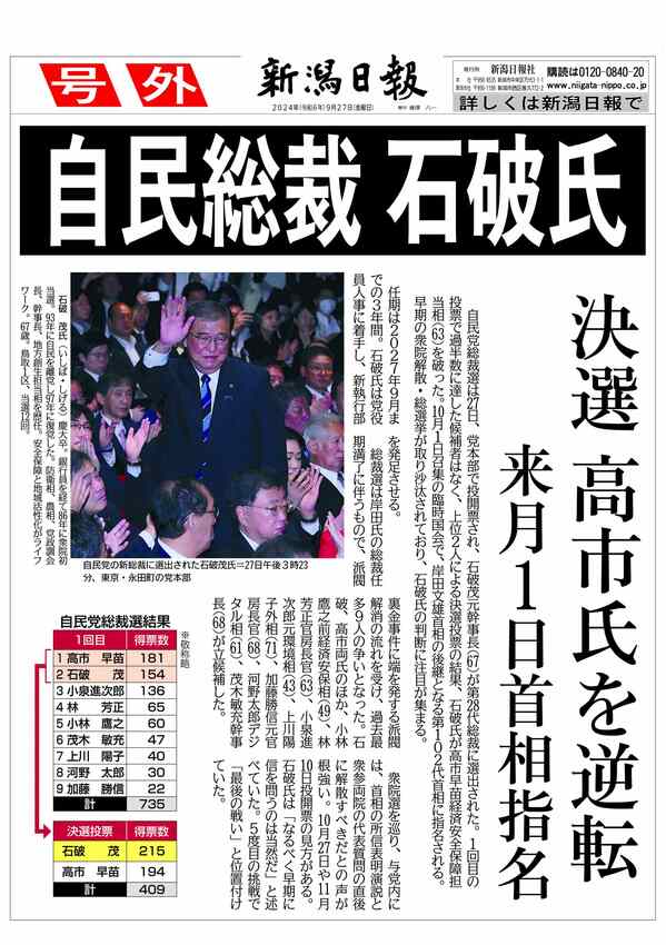 【号外】自民党新総裁に石破茂氏、決選投票で高市早苗氏破る 2024/9/27 16:10 PDFで号外を見る トップページで最新情報を見る 関連ニュース 【政治コラム・永田町天地人】首相の進退 覚悟なき「石破降ろし... 2025/8/26 [コラム・キャスターEYE]<「大きな言葉」>惑わされず目凝... 2025/8/19 【政治コラム・永田町天地人】石破降ろし “辞めない首相”は強... 2025/7/29 [政治コラム・永田町天地人]細川護熙元首相 多くの人材と戒め... 2025/6/24 [コラム・キャスターEYE]<自由の伝道師>対話重んじたメル... 2025/6/18 [政治コラム・永田町天地人]農相交代 コメは最大の選挙対策 ... 2025/5/27 [政治コラム・永田町天地人]コメ輸入問題 石破政権に大きな試... 2025/4/29 [コラム・キャスターEYE]<トランプ関税>教科書に載る歴史... 2025/4/22 【速報】韓国大統領を罷免、尹錫悦氏は即時失職 2025/4/4 [政治コラム・永田町天地人]商品券配布問題 首相の雄弁さがあ... 2025/3/25 [政治コラム・永田町天地人]岐路の連立政権 自民公明の間に隙... 2025/2/25 [コラム・キャスターEYE]<トランプ現象>民主主義 まさに... 2025/2/18