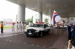 秋の全国交通安全運動(9月21〜30日)の一環で行われ、約30人が参加した。通行するドライバーに、市内の小学生が考えた交通安全標語が書かれたチラシや反射材などを配布。帛乙女2個も手渡して、飲酒運転防止や早めの点灯などを訴えた。ドライバーは丸々とした旬の帛乙女を手に笑顔で応えていた。
