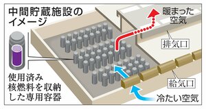 原発から出る使用済み核燃料原発で一度使用した燃料。原発の燃料は原料であるウラン鉱石を加工し、焼き固めた「ペレット」と呼ばれるものの集合体で、使用後も見た目や形は使用前と変わらない。使用済み核燃料の中にはウランやプルトニウムなどのまだ燃料として使える資源が95~97%残っているとされる。を一時保管する中間貯蔵施設原発から出た使用済み核燃料を、再処理するまで一時的に貯蔵する施設。日本原燃の再処理工場(青森県六ケ所村)の稼働遅れで、電力各社は燃料保管先の確保を迫られ、原発敷地内での貯蔵施設整備などを進める。東京電力と日本原子力発電は共同出資で「リサイクル燃料貯蔵」を2005年に設立し、青森県むつ市に施設を建設した。金属製容器に入れた燃料を屋内で自然冷却する。建設済みの建屋1棟目に3千トン、増設予定の2棟目に2千トンを最長50年間保管する計画。(青森県むつ市)に9月下旬、新潟県の柏崎刈羽原発新潟県の柏崎市、刈羽村にある原子力発電所で、東京電力が運営する。1号機から7号機まで七つの原子炉がある。最も古い1号機は、1985年に営業運転を始めた。総出力は世界最大級の約821万キロワット。発電された電気は関東方面に送られる。2012年3月に6号機が停止してから、全ての原子炉の停止状態が続いている。東電が原発を再稼働させるには、原子力規制委員会の審査を通る必要がある。7号機は2020年に全ての審査に「合格」したが、安全対策を施している最中で、再稼働していない。の燃料が初めて搬入された。中間貯蔵施設では、発熱を続ける使用済み核燃料を入れた円筒状の金属容器を、空気の自然な流れを利用して冷却する。電気や水は不要で、原発の燃料プールと比べて安全性が高いとされる。容器にはいくつもの安全対策が講じられているが、施設自体は「巨大な倉庫」だ。