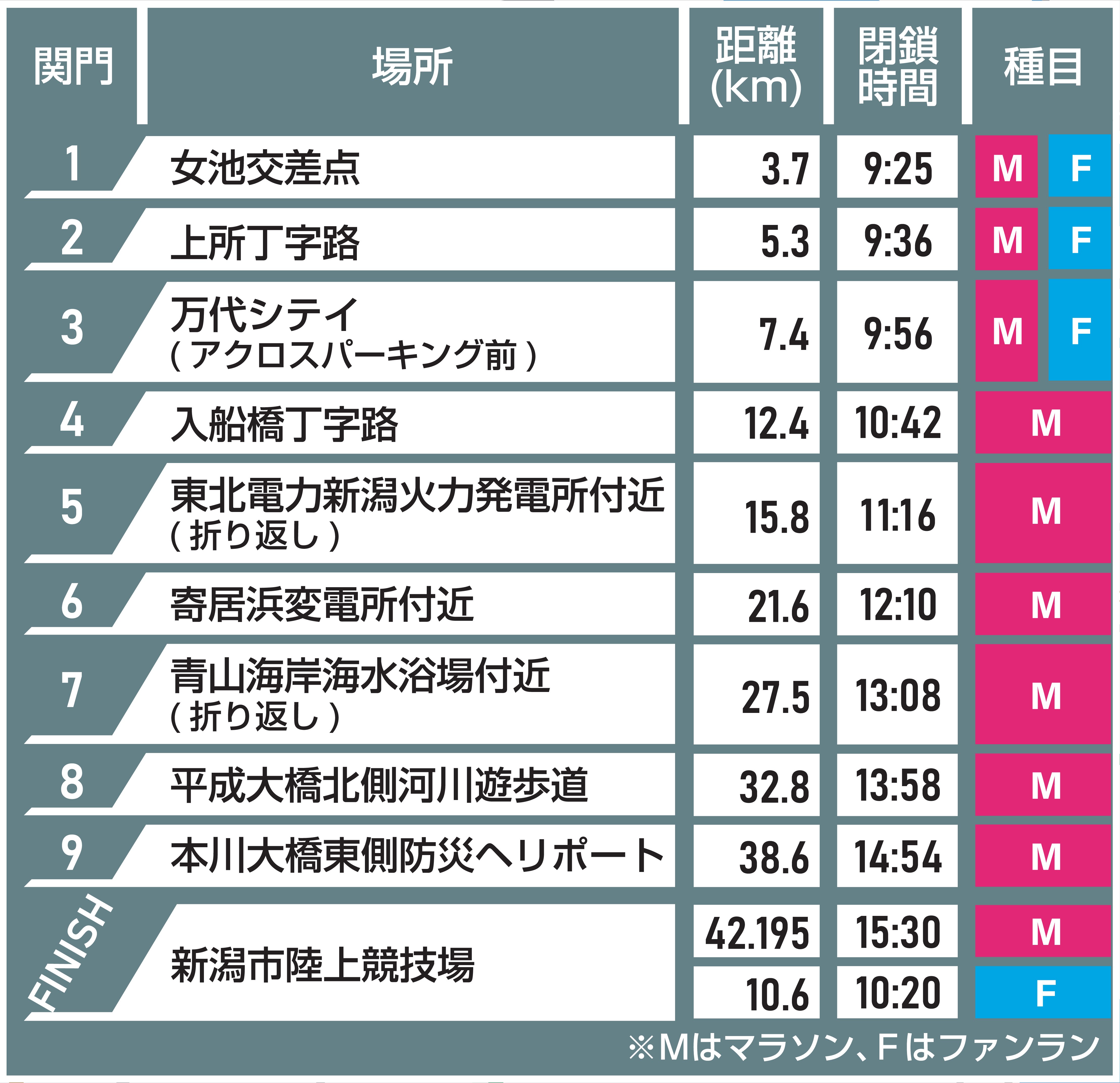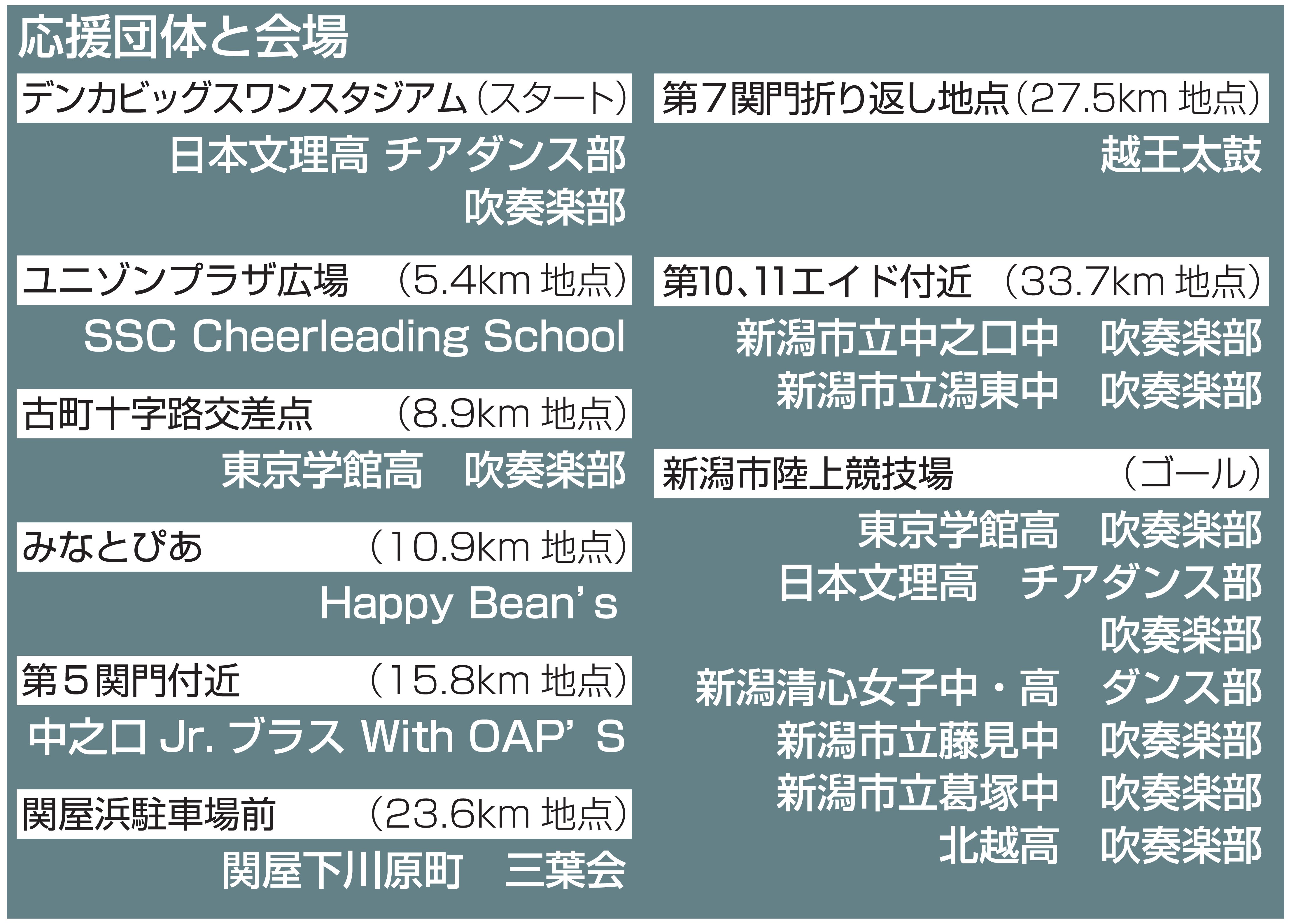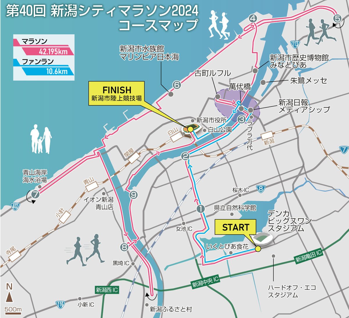 フルマラソン、ファンランはともに、デンカビッグスワンスタジアム前を午前8時半にスタートします。ゴールは新潟市陸上競技場です。