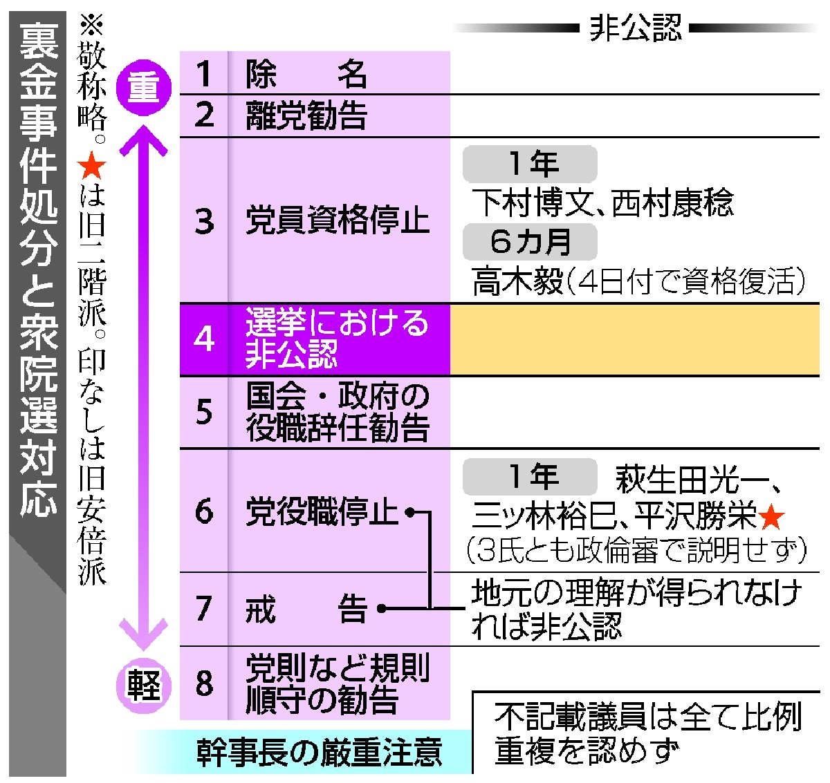 新潟県関係では、いずれも旧安倍派の、細田健一衆院議員(旧新潟2区)と高鳥修一衆院議員(比例北陸信越)が戒告処分を受けている。自民党県連は細田氏を新2区、高鳥氏を新5区で公認申請した。
