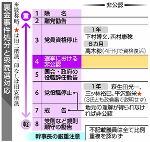 自民の党都道府県連からの公認申請は7日に締め切った。執行部は、党役職停止や戒告処分でも地元理解が十分でない議員は非公認とする基準に照らし県連の意見、党の情勢調査を踏まえ公認可否を判断する。党幹部は「非公認は10人以上になるかもしれない」との見通しを記者団に示した。