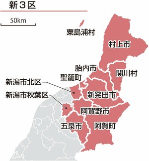 新潟3区は山形県境から新潟市まで10市町村にまたがる。旧3区に、新潟市秋葉区とこれまで3選挙区に分かれていた新潟市北区の全域が加わった。秋葉、北両区で無党派層をいかにつかむかが勝敗の鍵となる。自民党前職の斎藤洋明氏(47)、立憲民主党元職の黒岩宇洋氏(57)の5度目となる因縁の対決を軸に、日本維新の会新人の吉村祐一郎氏(49)が挑む構図が予想される。...