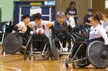 選手たちは3チームに分かれ、試合時間6分×4ピリオドの総当たり戦を行った。競技用車いすを激しくぶつけ合ったり、力強く車...