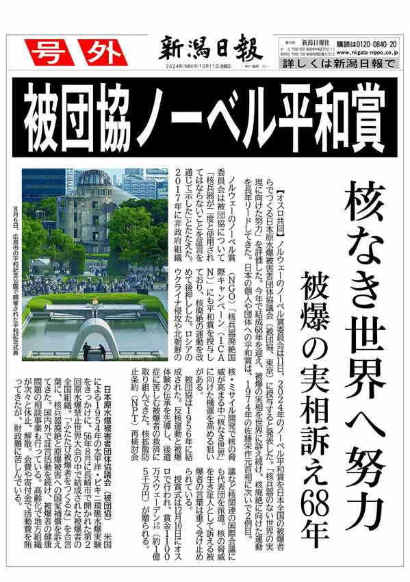 【号外】ノーベル平和賞に日本原水爆被害者団体協議会 2024/10/11 19:25 PDFで号外を見る トップページで最新情報を見る 関連ニュース 【号外】新潟県知事が柏崎刈羽原発再稼働を容認 11/21 【号外】日経平均初の5万円台 10/27 【号外】新首相に高市早苗氏、女性で初めて選出 10/21 【号外】燕市の新市長に前市議の佐野大輔氏 10/20 【号外】北信越高校野球・帝京長岡が優勝 10/19 【号外】公明党が連立政権離脱へ 10/10 【号外】ガザ全人質解放へ 10/9 【号外】ノーベル化学賞に北川進京都大特別教授 10/8 ノーベル化学賞に京都大特別教授の北川進氏ら 10/8 【号外】ノーベル生理学・医学賞に大阪大栄誉教授の坂口志文氏ら3氏 10/6 【号外】自民党新総裁に高市早苗氏 10/4 【号外】石破茂首相が辞任の意向 9/7