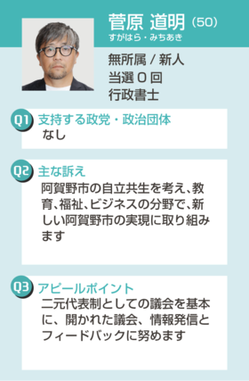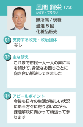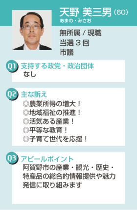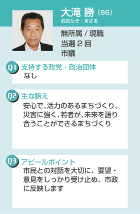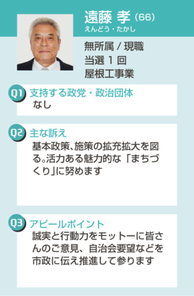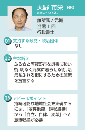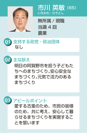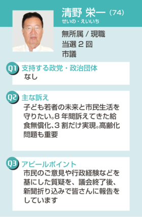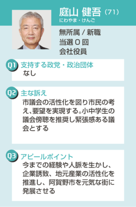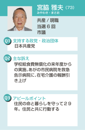 ◇阿賀野市議選立候補者(届け出順・定数16-18) 清野栄一 74 市議 無現(2) 庭山健吾 71 会社役員 無新 市川英敏 65 農業 無現(4) 宮脇雅夫 73 市議 共現(6) 遠藤孝 66 屋根工事業 無現(1) 天野市栄 66 行政書士 無元(1) 菅原道明 50 行政書士 無新 荒...